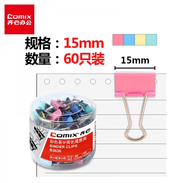 齊心B3636彩色長尾票夾15mm*60只/筒*10