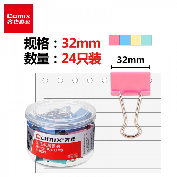 齊心B3633彩色長尾票夾32mm*24只/筒*12