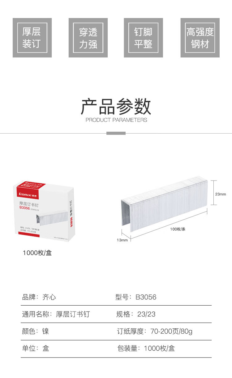 齊心B3059厚層訂書釘(23/13)100頁*10