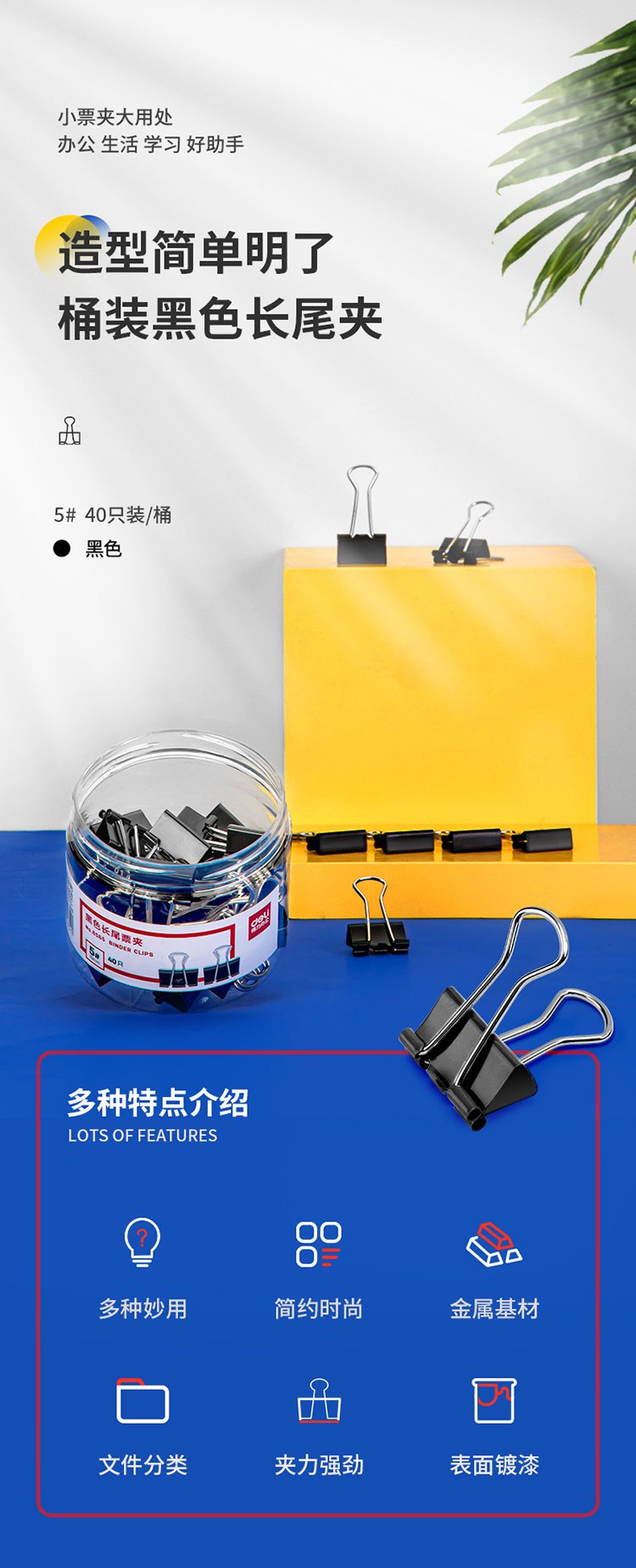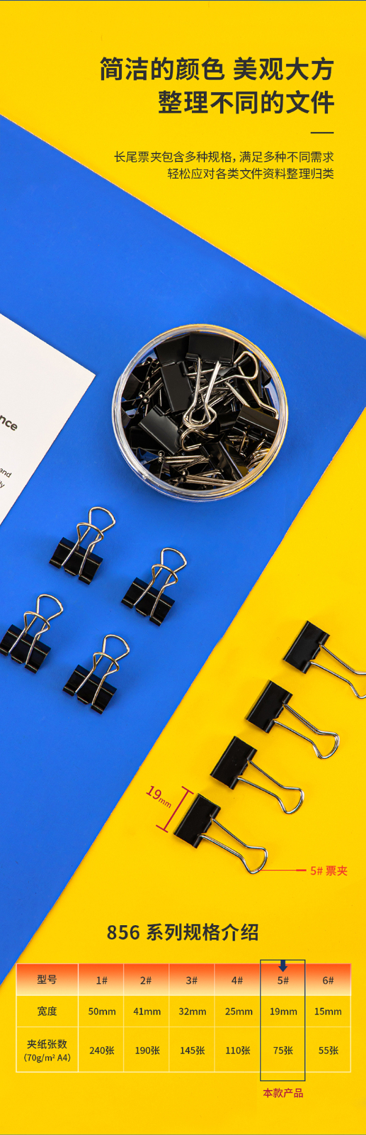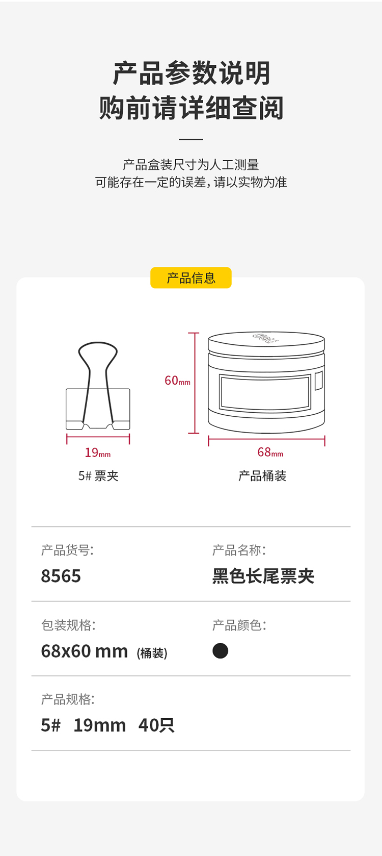 得力8565-5#黑色長尾票夾筒裝19mm*40只/筒