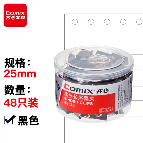 齊心B3628黑色強力長尾票夾25mm*48只/筒*12