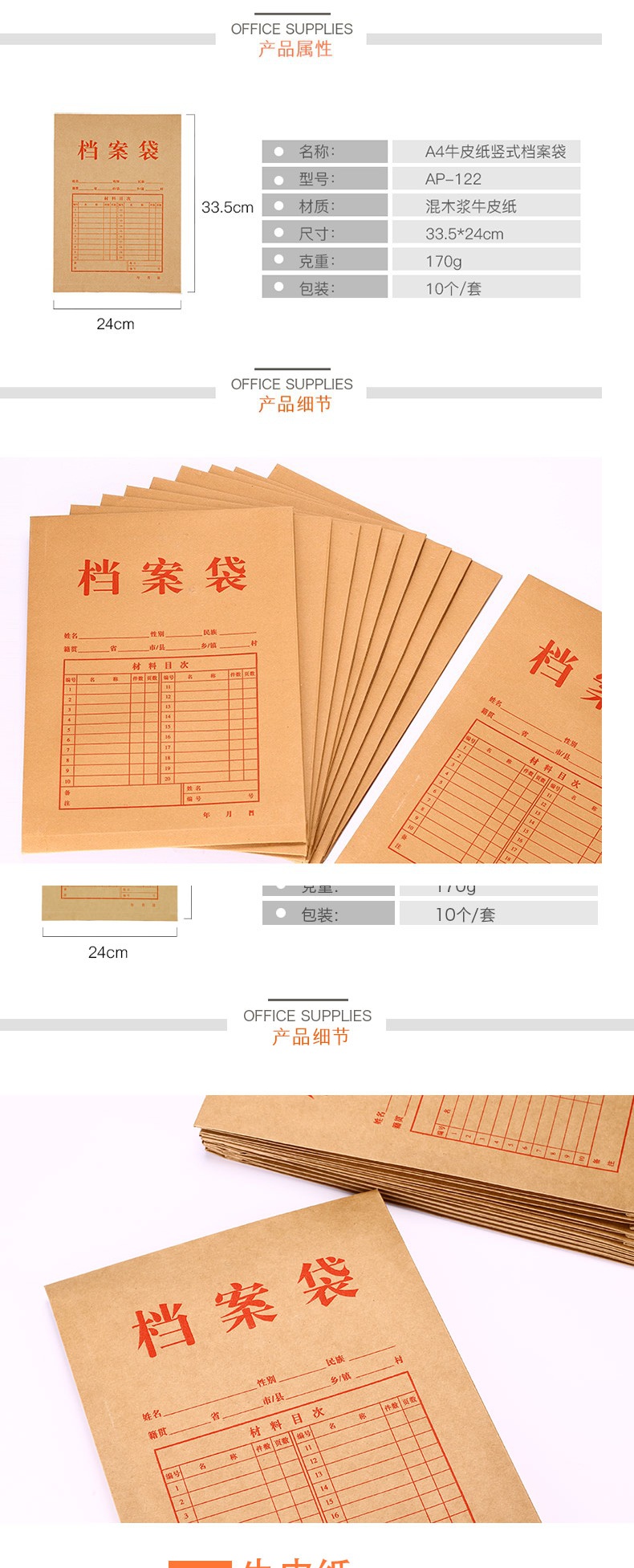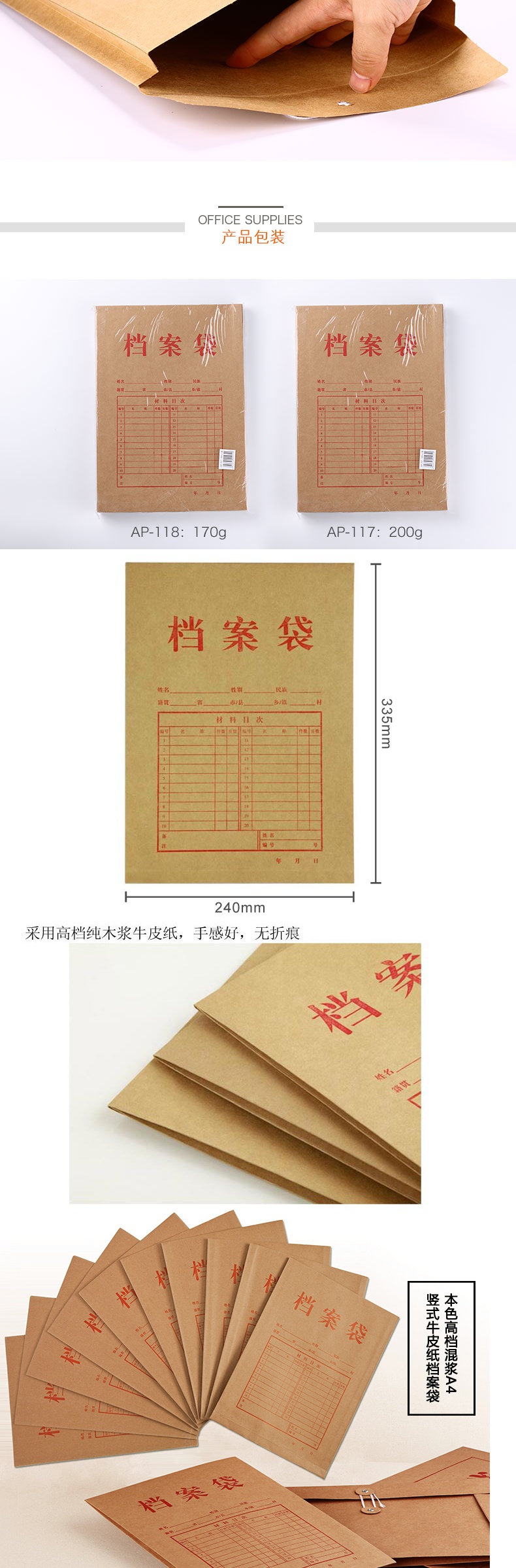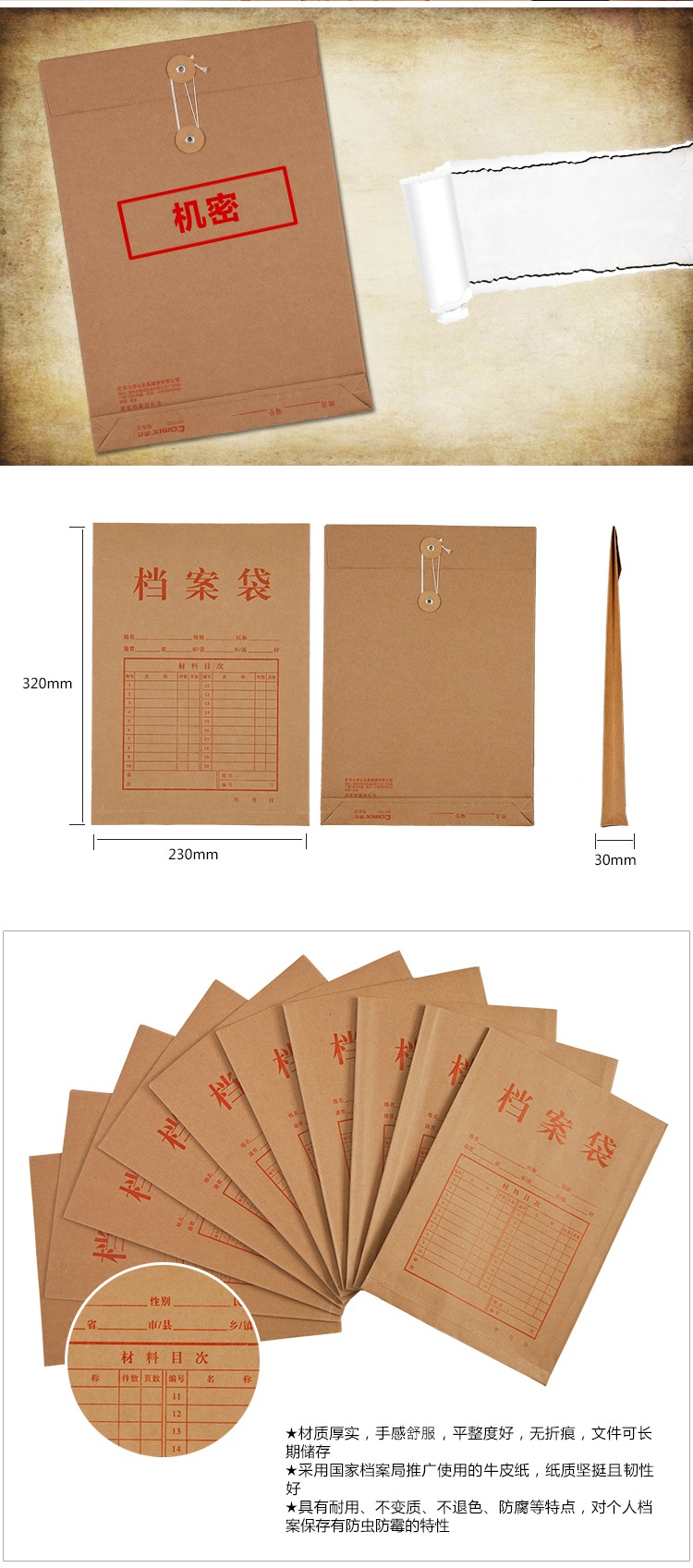 齊心AP-118本色純木漿牛皮紙豎式檔案袋A4 10個/套*30