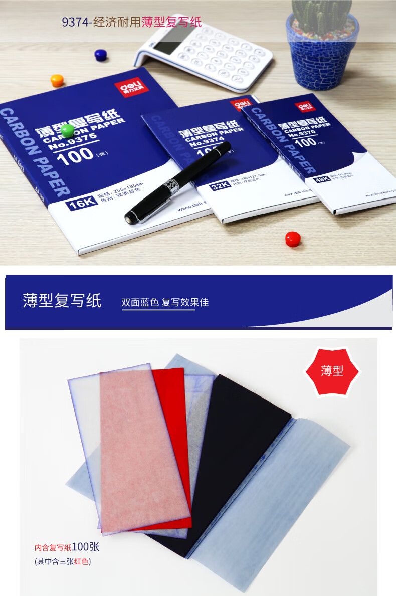 得力9374薄型復寫紙(藍)(12.7*18.5cm)-32K(100張/盒)