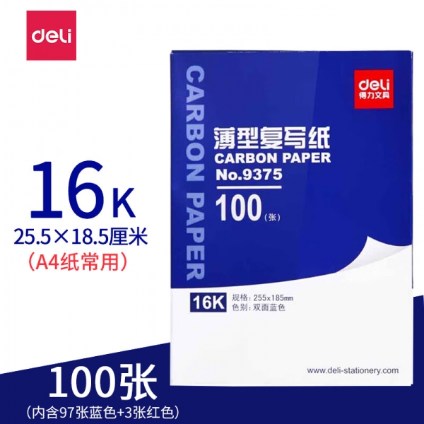 得力9375薄型復(fù)寫紙(藍(lán))(25.5*18.5cm)-16K(100張/盒)