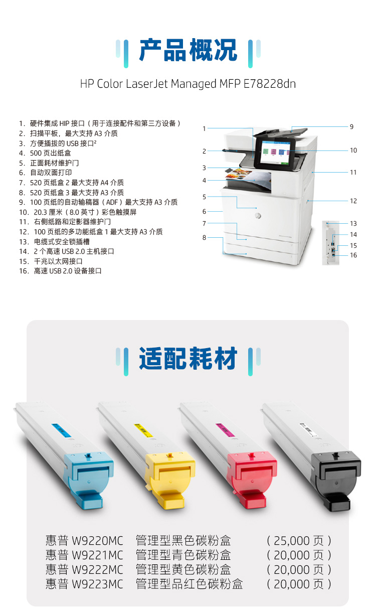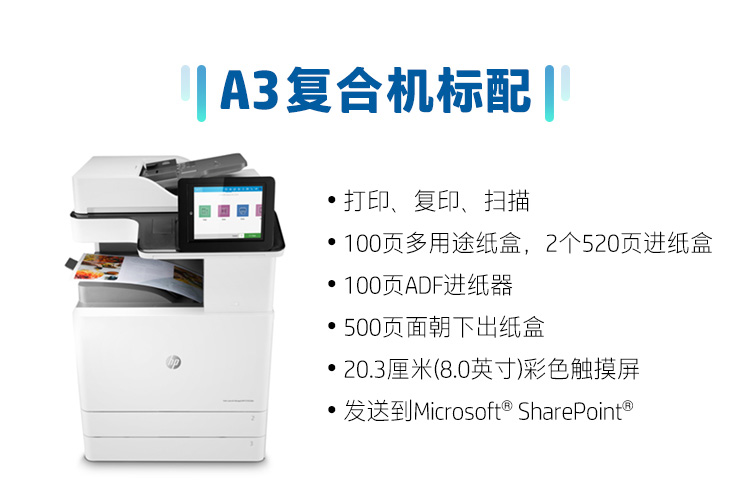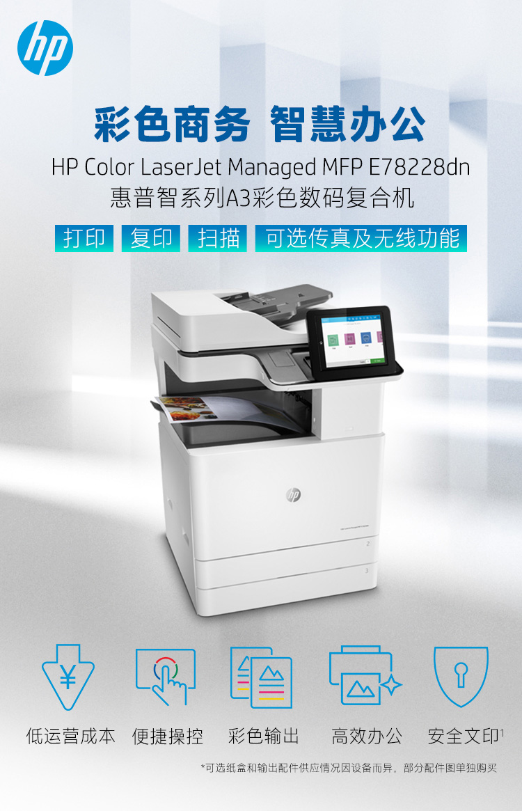 惠普E78228dn A3彩色激光復(fù)合機(jī):打印、復(fù)印、掃描、雙面器、雙面輸稿器、2紙盒