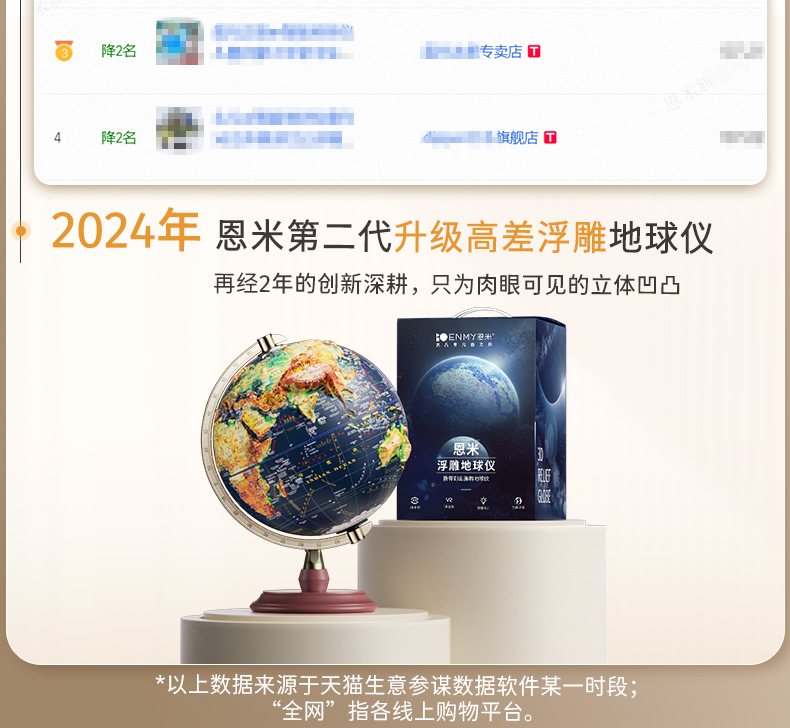 恩米科技YSE33-金屬底座升級高差浮雕地球儀-32cm-電鍍銀萬向刻度-三檔燈帶AR-禮盒裝