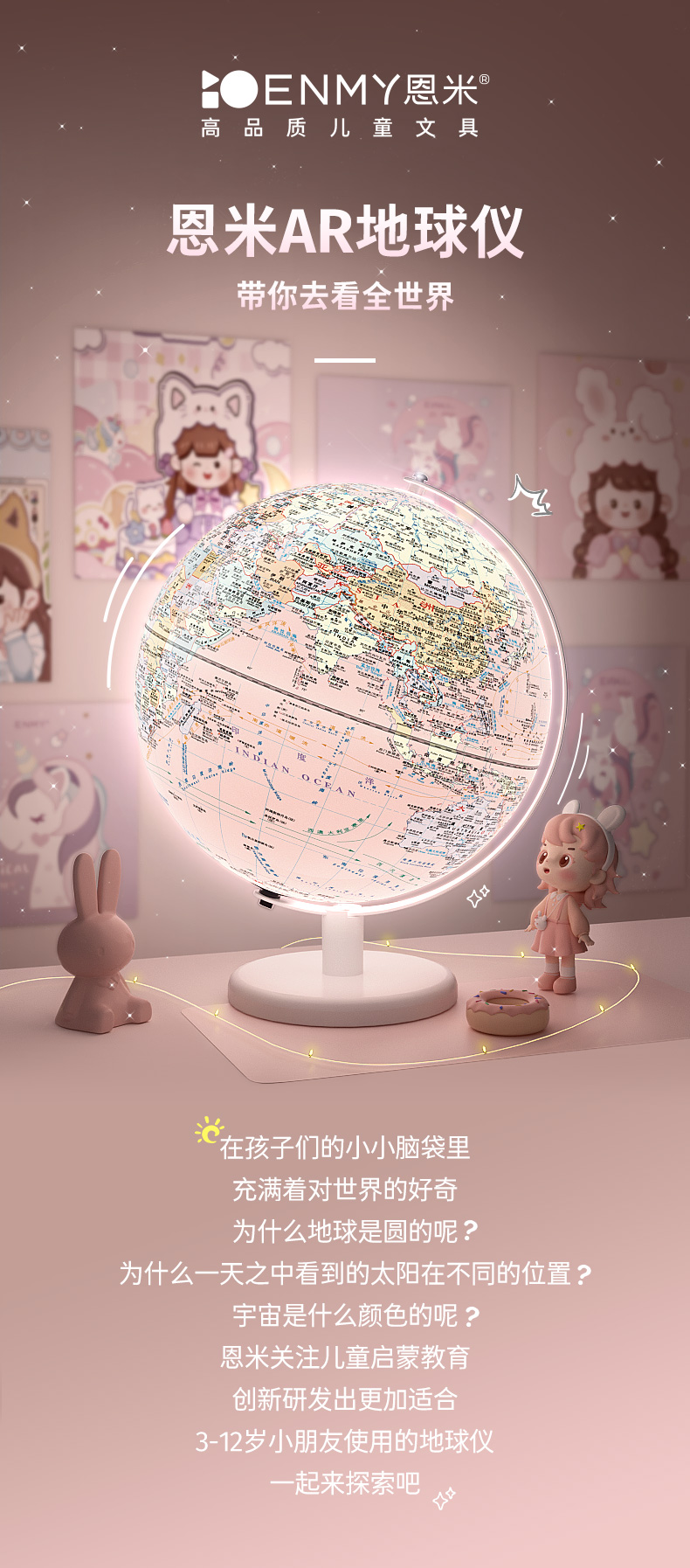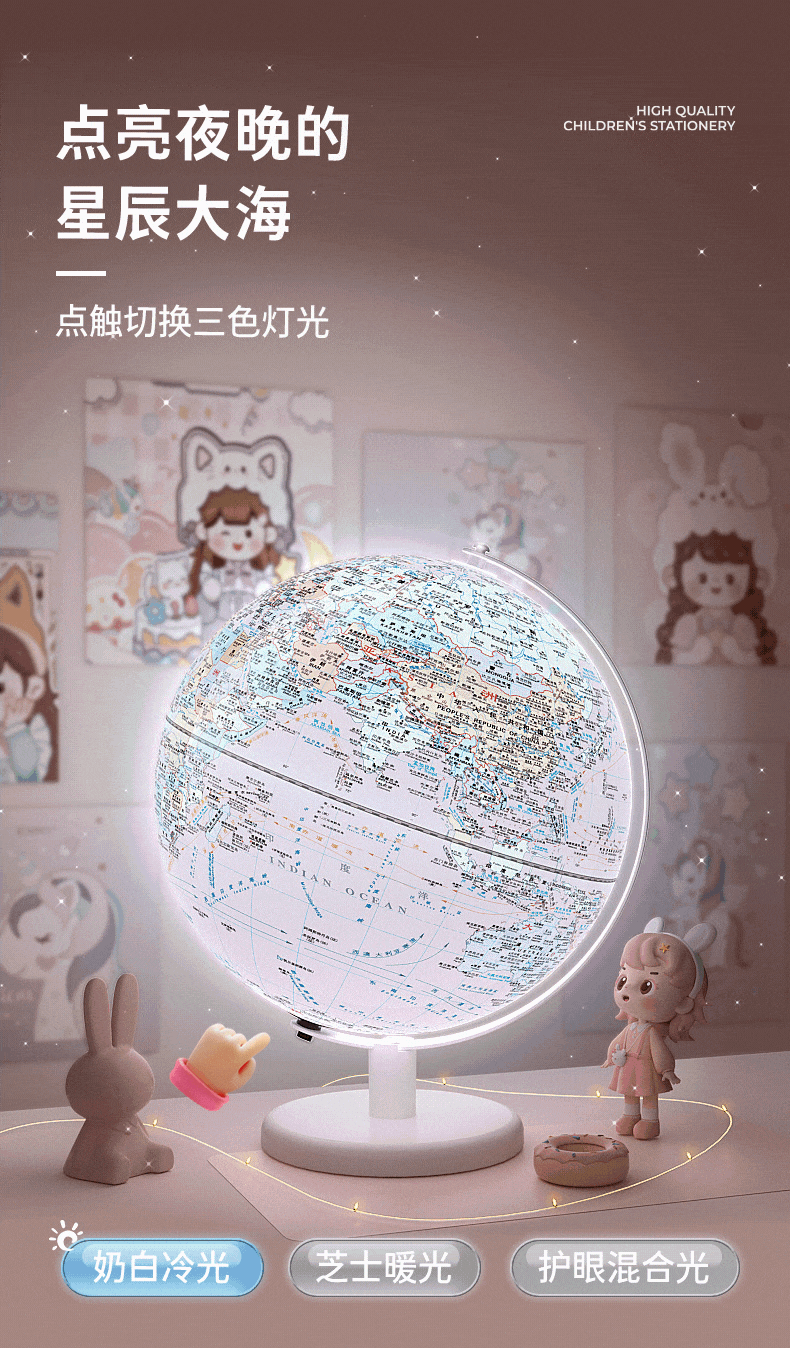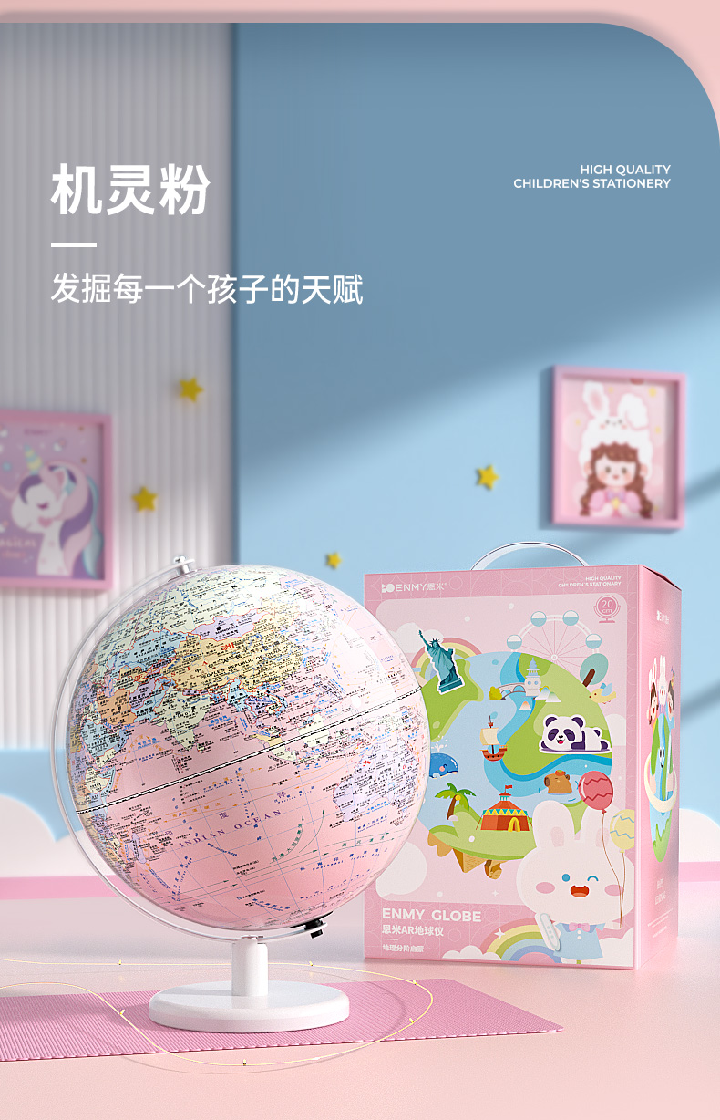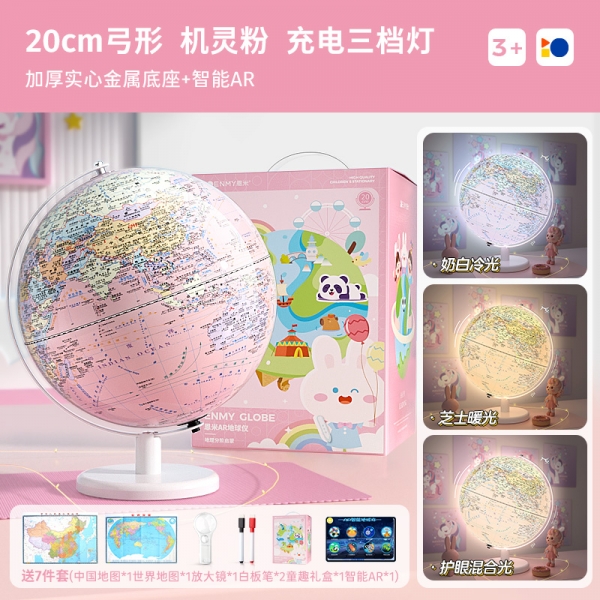 恩米科技YSE38-金屬底座馬卡龍藍(lán)地球儀-20cm-弓形扁鐵支架-三檔燈帶AR-童趣禮盒裝